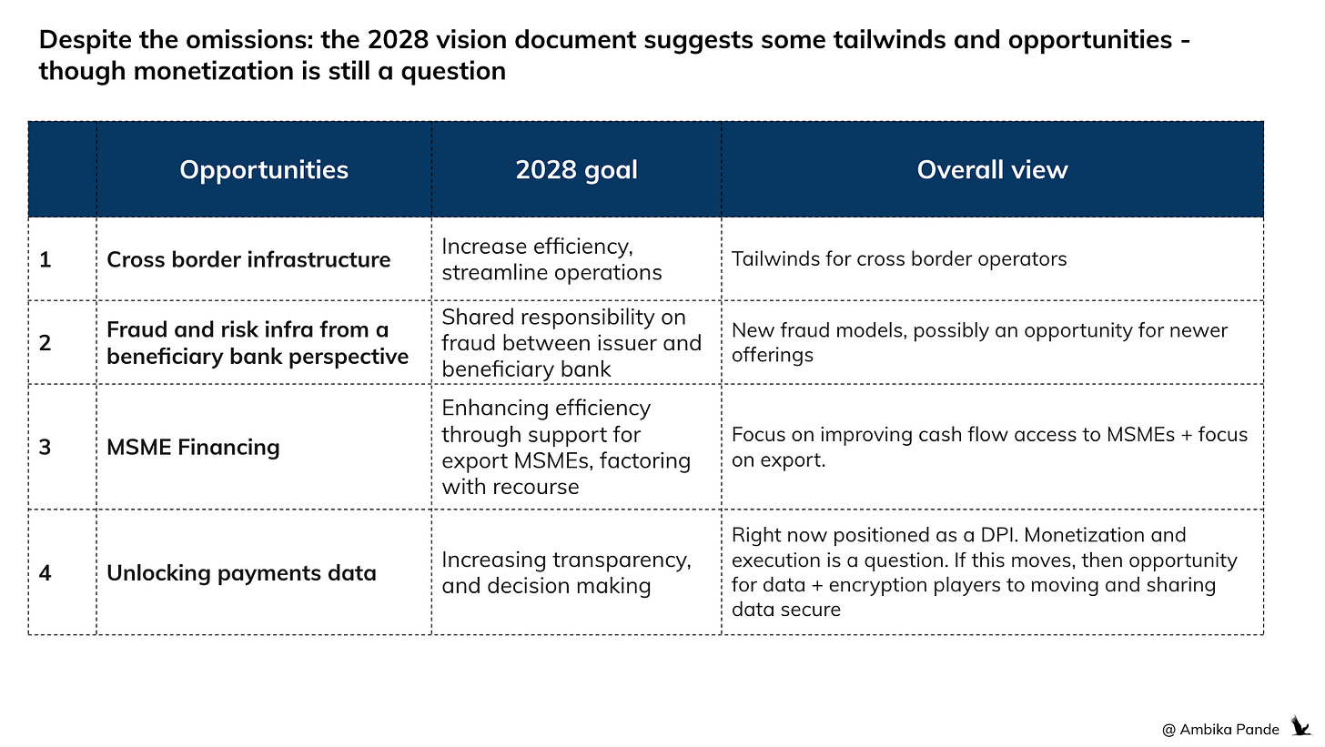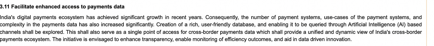 🔴 Issue #2: 0 MDR benchmark not addressed: There is nothing on pricing or a monetization focus in the fintech sector. Now, while there have been reports that the Standing Committee of Finance is evaluating some MDR on UPI (per calculations, global benchmarks are at 0.3% MDR, and UPI requires 0.15% per transaction to sustain the eecosystem. For calculation details, you can check out my article on this here: [#56] FY25 Budget Implications on UPI (Part 1): MDR on regular UPI transactions is now essential. But it is very surprising that despite all the chatter, all the proposals, there is nothing about this in the 2028 vision document for payments!