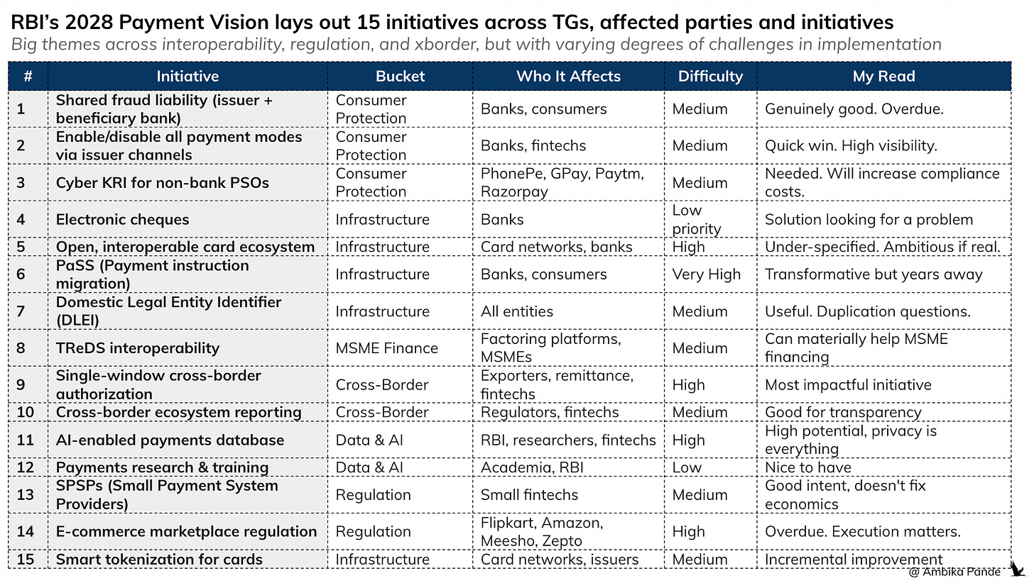 Over the last few weeks, RBI quietly dropped its Payments Vision 2028, which is a 15-initiative, 3 year roadmap themed “Shaping India’s Payment Frontier.” It covered a lot, from fraud liability changes, cross-border simplification, an AI-enabled payments database, and, maybe the most interesting bit - a signal that e-commerce platforms might come under direct RBI regulation.