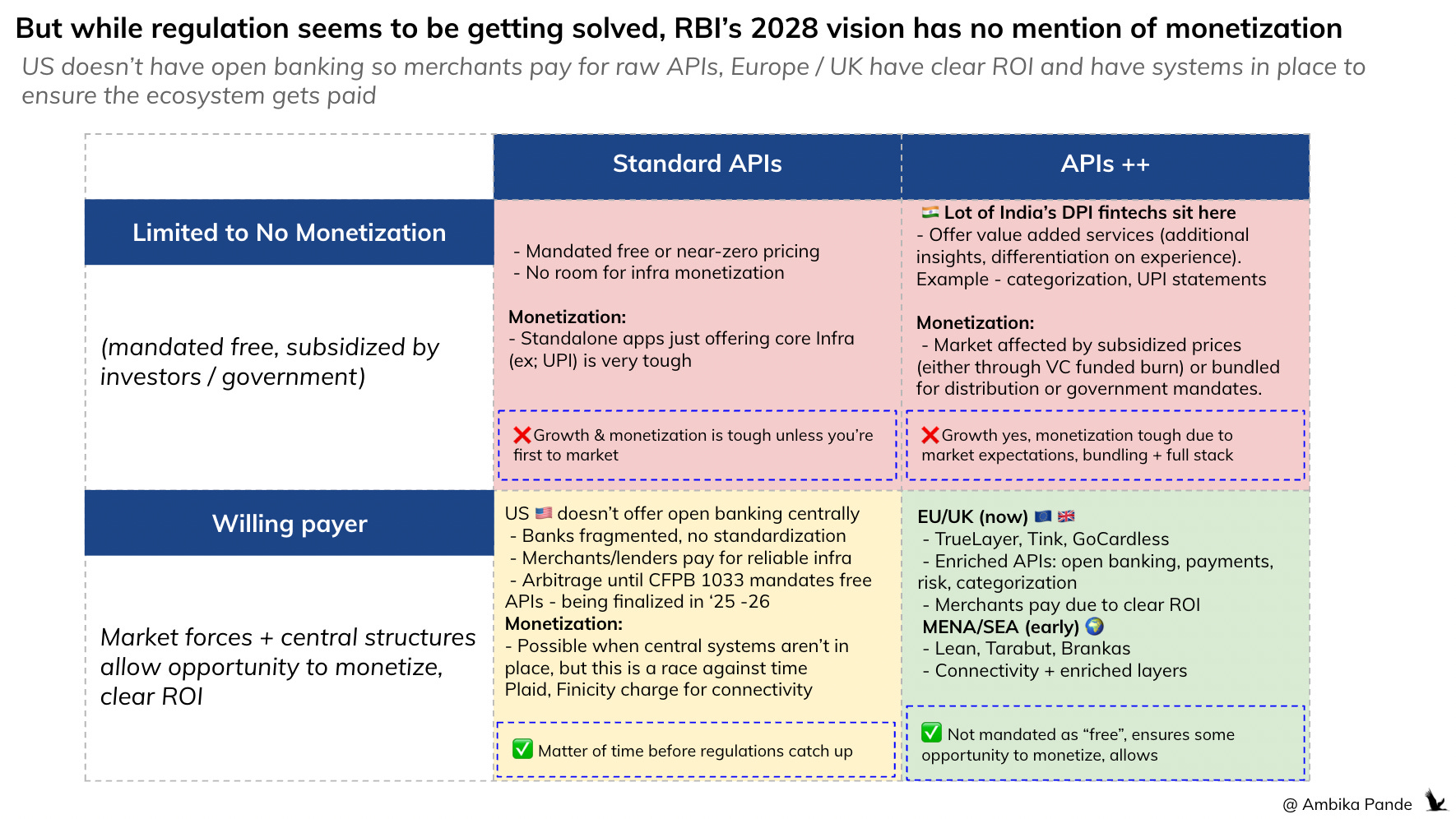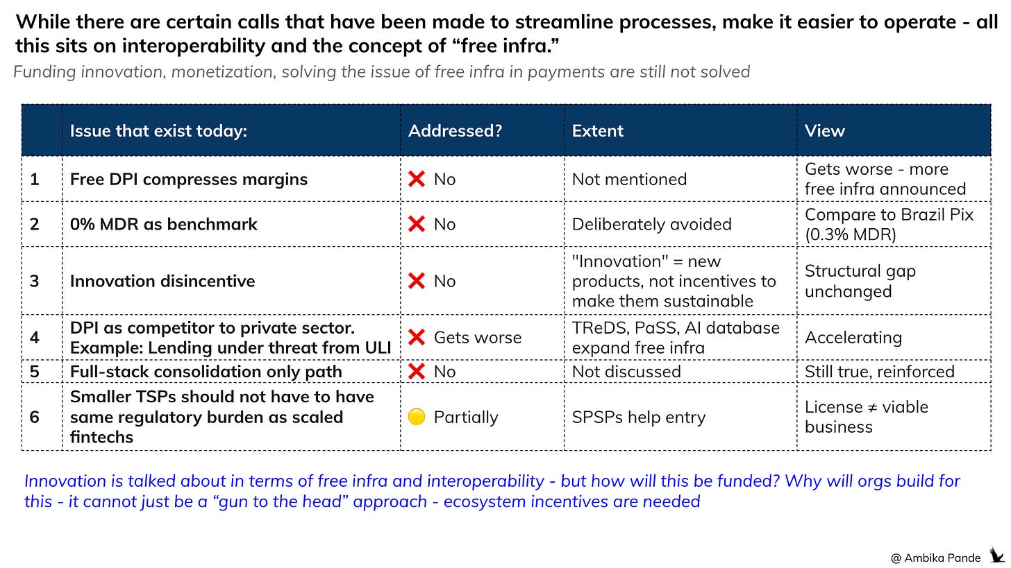 🔴 Issue #1: Free DPI compresses margins not addressed: Not mentioned. Infact this gets worse, there is more “free infra” (assumed free due to absence of monetization framework) such as the AI powered payments piece. In fact, with the focus on “greater good” type initiatives, interoperability - somewhere, I’m questioning ohw sustainable this ecosystem is. We cannot keep relying on government subsidies. And let us be honest, in this whole “narrative” of keeping these as ‘public good’ it is the average Indian who is funding this from taxes. If I’m anyway paying for it (indirectly), then why not just make it into a framework that promotes innovation, instead of stakeholders having to rely on government handouts?