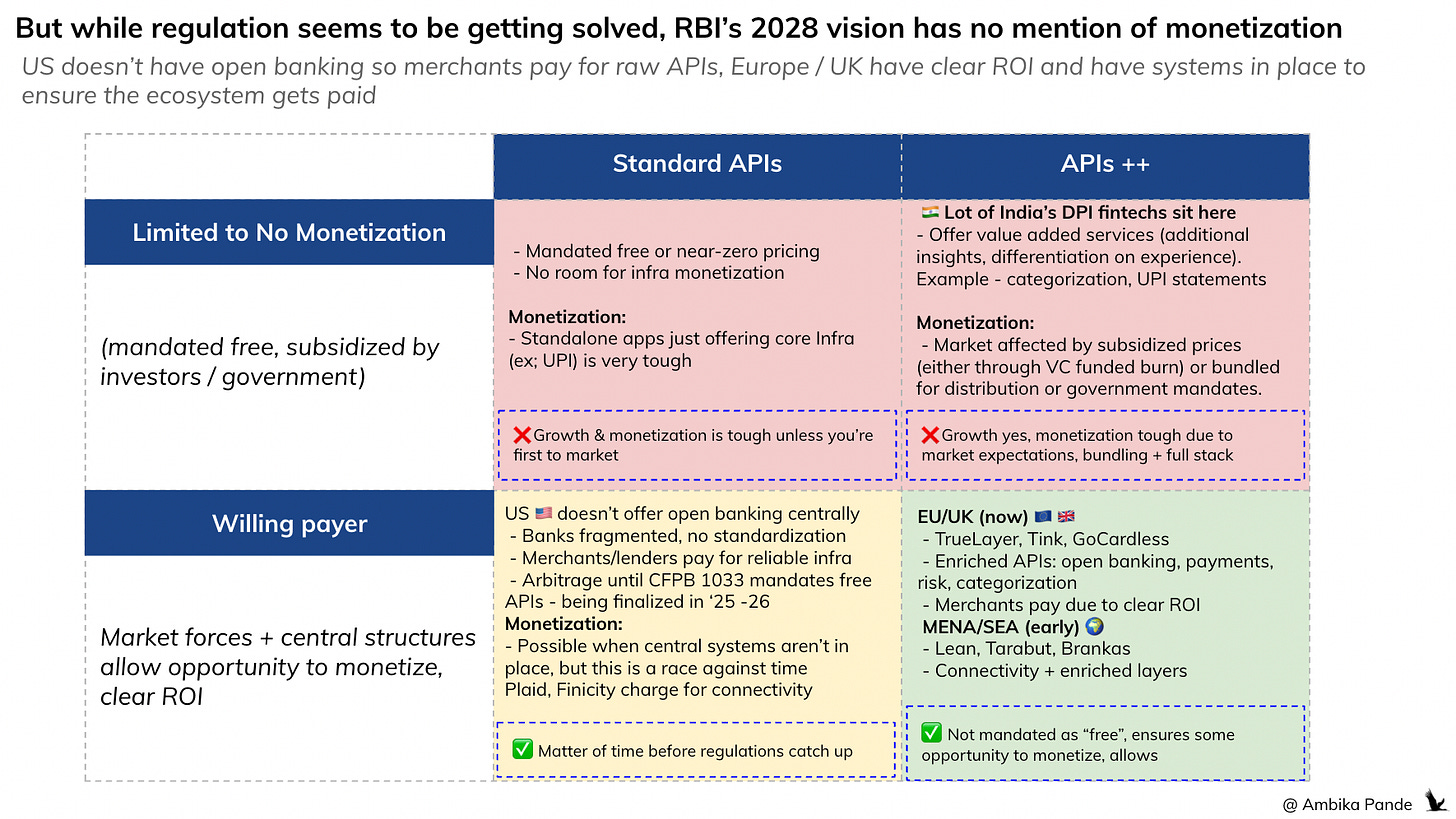But here’s what I was really looking for. A few months ago, in the article above, I wrote about the structural squeeze on Indian fintechs - free DPI compressing margins, standalone TSPs disappearing, the license requirements constraining innovation, even in smaller fintechs, full-stack conglomeration as the only survival strategy. The question I ended with: does free DPI unlock innovation, or constrain it by eliminating economic incentives? So when the regulator releases a vision document for payments, the next three years, the first thing I’m checking: does it address any of what I flagged?