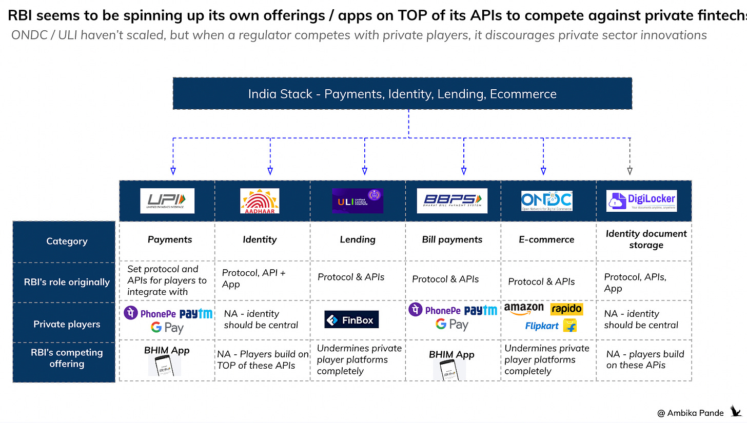 🔴 Issue #4: DPI as a competitor to the private sector. This gets worse. TreDs, PaSS etc. Add to this the whole push of ULI, ONDC. The BHIM App piece that I already mentioned. What’s the point of waiting for innovation to come in and building a competing product centrally? This actually de-incentivizes any innovation here.