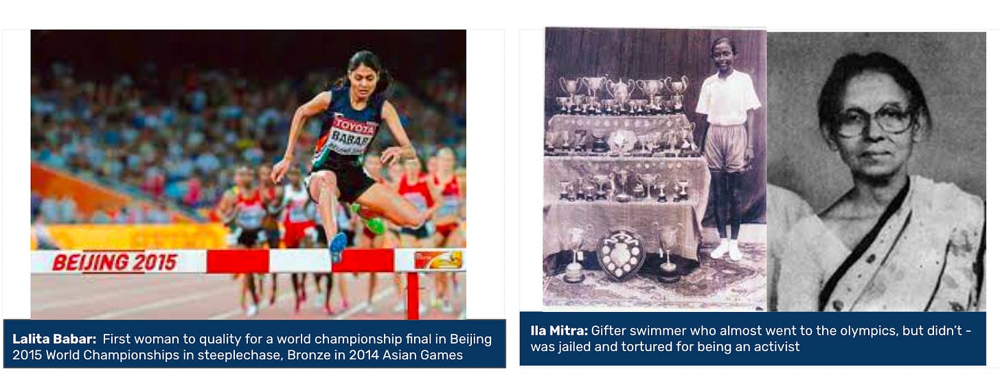 A lot of times, it’s not even about access. It is about belief. In school, I remember there were girls & boys teams for football. A lot of times the PE teacher (predominantly male), couldn’t be bothered to pay attention to the girls team, or coach them up. What would happen is that they would appoint 2 players from the boys team and say “tum dekh lena.” (you guys please see). This matters. It’s sending a message saying that girls aren’t that important for us to focus our time on. A lot of times it’s not the obvious barrier. It’s these details - the death by a thousand cuts that end up making the decision for a lot of women. And that’s what the book mentions - these women who paved a path for the rest of us had overpowering belief, and a parent / coach / support figure who played a part in building their mental fortitude. We say that what sets sportspersons apart is their towering self belief. A lot of the building blocks of this are laid when they have people who believe in them, even when they don’t believe in themselves.