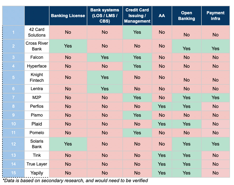Cross River Bank - US based, and projected to IPO in 2025 (which has partnered with the likes of Stripe to enable early wage access to delivery partners), and Solaris Bank, which has a banking license and is based out of Germany. I’d also place M2P in this segment, since it does a lot of payment infrastructure work