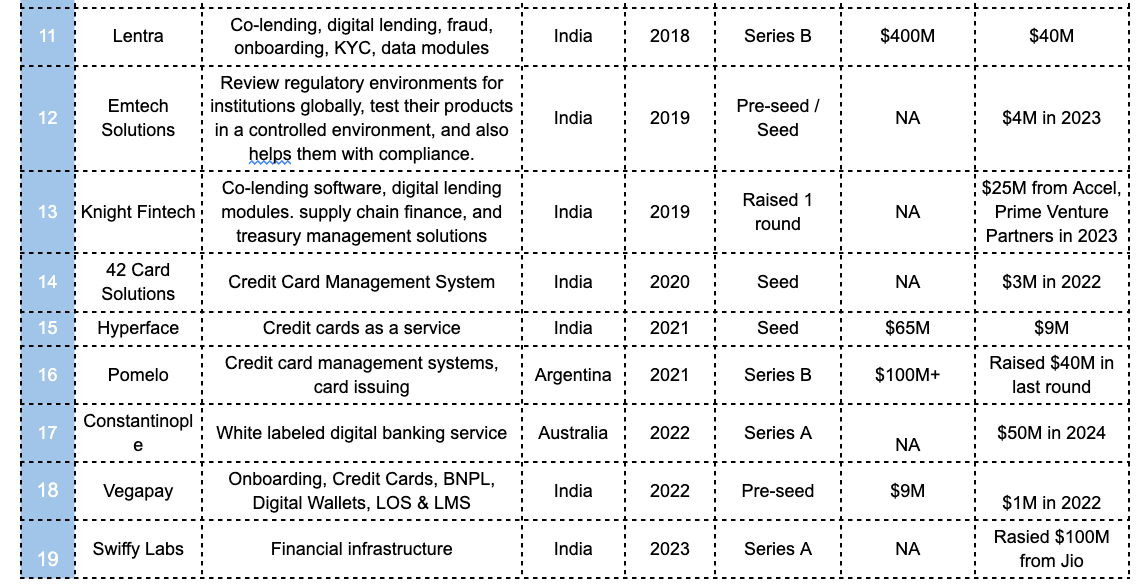 This caters to not just LOS / LMS solutions, but also features such as CBS, co-lending, and in the case of Knight Fintech, treasury management & supply chain financing modules, which can be plug & play features, and eventually be invested in and absorbed by the bank itself. An example is Cashinvoice, a supply chain financing solution which raised a $4.3M round in 2024 led by HDFC Bank. Lentra is another: a leading LOS / LMS player that has been invested in by HDFC bank