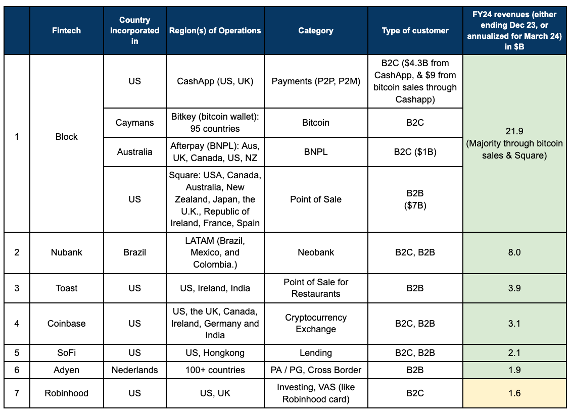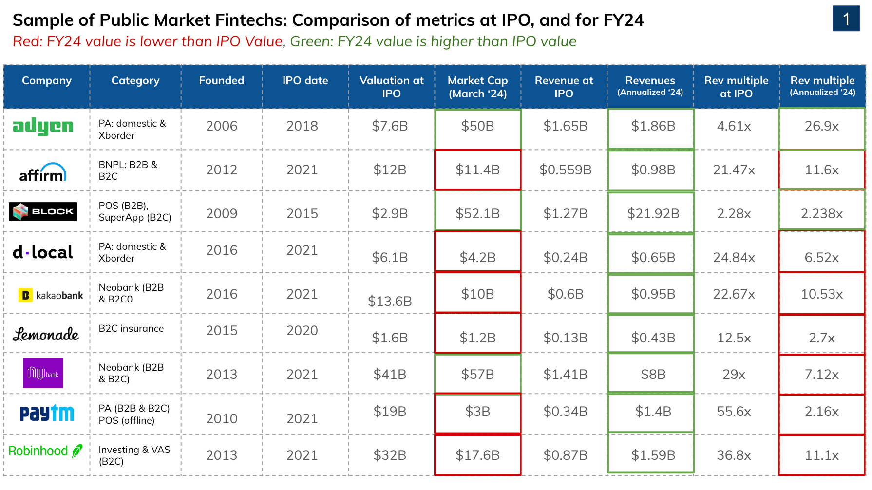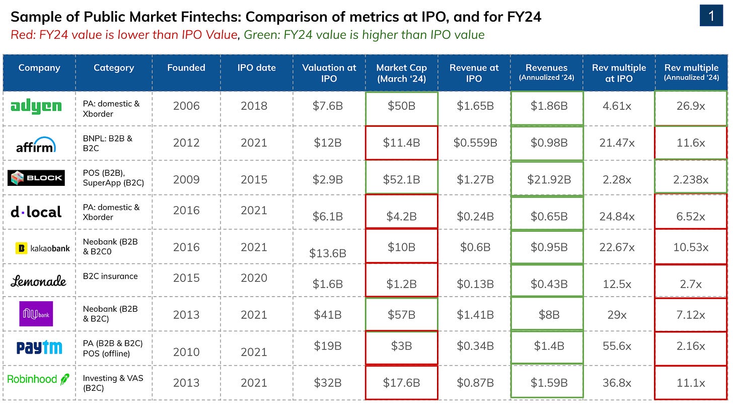 With all the buzz about the big Fintech IPOs expected in India and in the world between 2024 - 2026, I was curious about how the Fintechs which IPO’ed in the 2015 - 2021 era are doing. (Adyen, Robinhood, Affirm, Zip, SoFi, Block, Nubank and others). And what are some insights / learnings we can take away which could be relevant for the new batch of Fintechs expected to IPO in the next 2-3 years, and the overall Fintech industry.