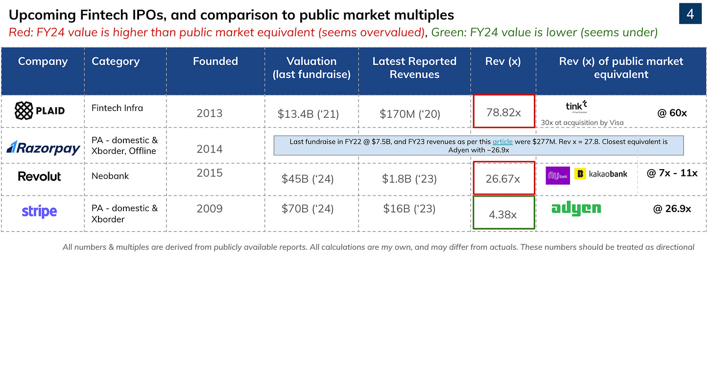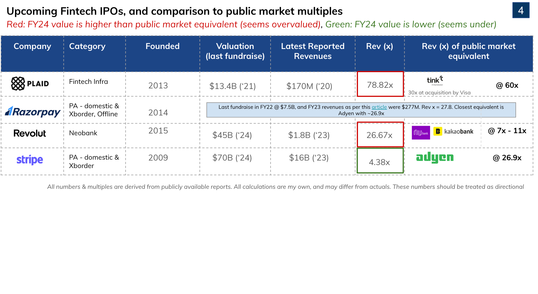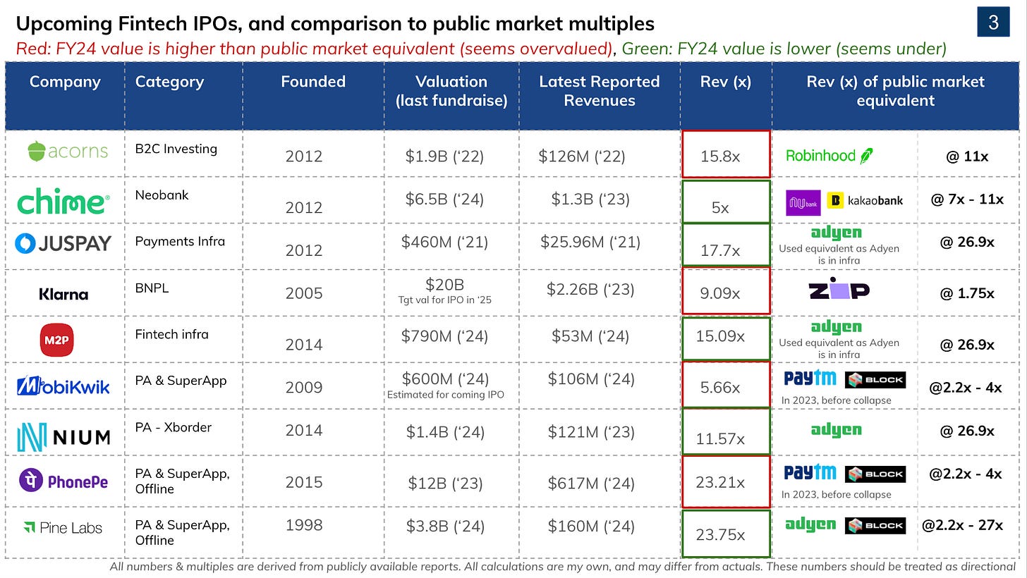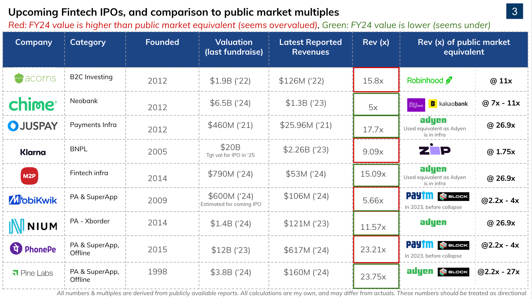 (Update from Dec 2024): Mobikwik IPO is planned for 11th December 2024, and its valuation has been cut further to ~$256M, which is on par with the 2x - 4x range of public market equivalents.PhonePe: Operates in India, latest rev multiple = 33.8x. Higher than the market, but PhonePe has also launched UPI international payments (Singapore, UAE), and while domestic UPI payments are free, international UPI payments will have a forex charge, of which I assume PhonePe will make a cut. PhonePe is also in insurance, and stockbroking, and expected volumes from these initiatives is what it’ll expect to justify its valuation