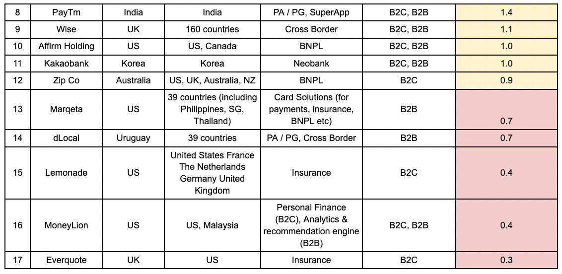 Acorns: Latest rev multiple: 20.65x. Also operates only in the US and is B2C. May be overvalued based on these numbers