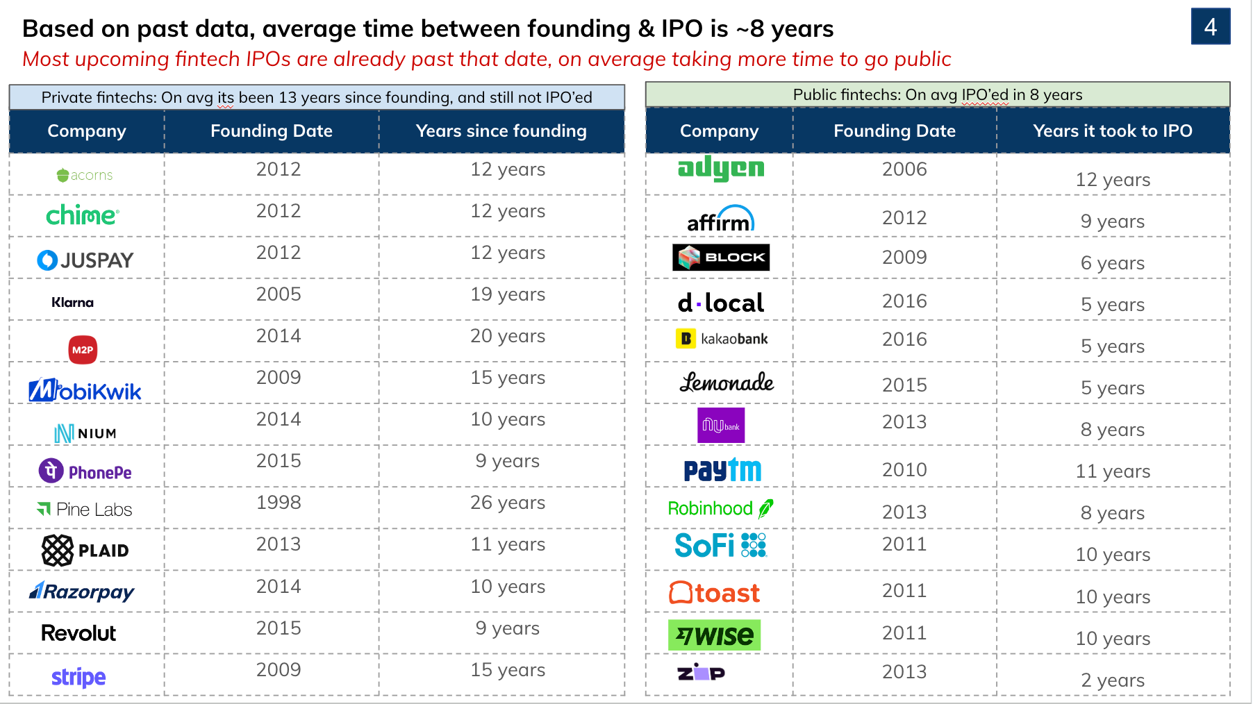 1. Average & median time between Founding & IPO was 8 years, current fintechs have already breached that landmark