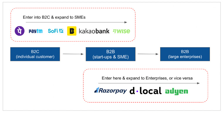 1. B2C & SME customer base: These are usually companies (Cue Paytm in India) that start off with a B2C offering, and see synergies to expand with similar products into the SME space (cue sole proprietorships, employee count < 10 etc). Other examples are Kakaobank (neobank in Korea), and SoFi (Lending).