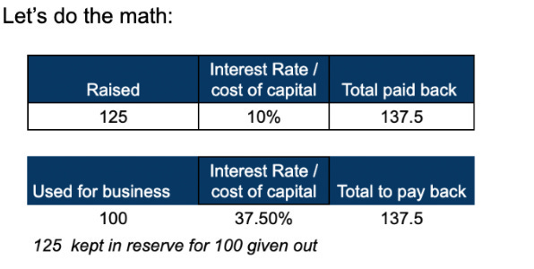 If more capital is taken for the same amount of business, then the actual cost of funds I’m paying for the business becomes higher. Example. If I want to lend Rs 100, I will have to raise an extra Rs 125 to keep as reserve, instead of an extra Rs 100 as reserve. So I will have to give a return back on the amount raised (which is Rs 125), but I can only use 80% of the money raised to give that return. So in actuality, my cost of capital (as an NBFC) becomes quite high, because I am being charged on the amount I can use (which is Rs 100), versus the amount I have