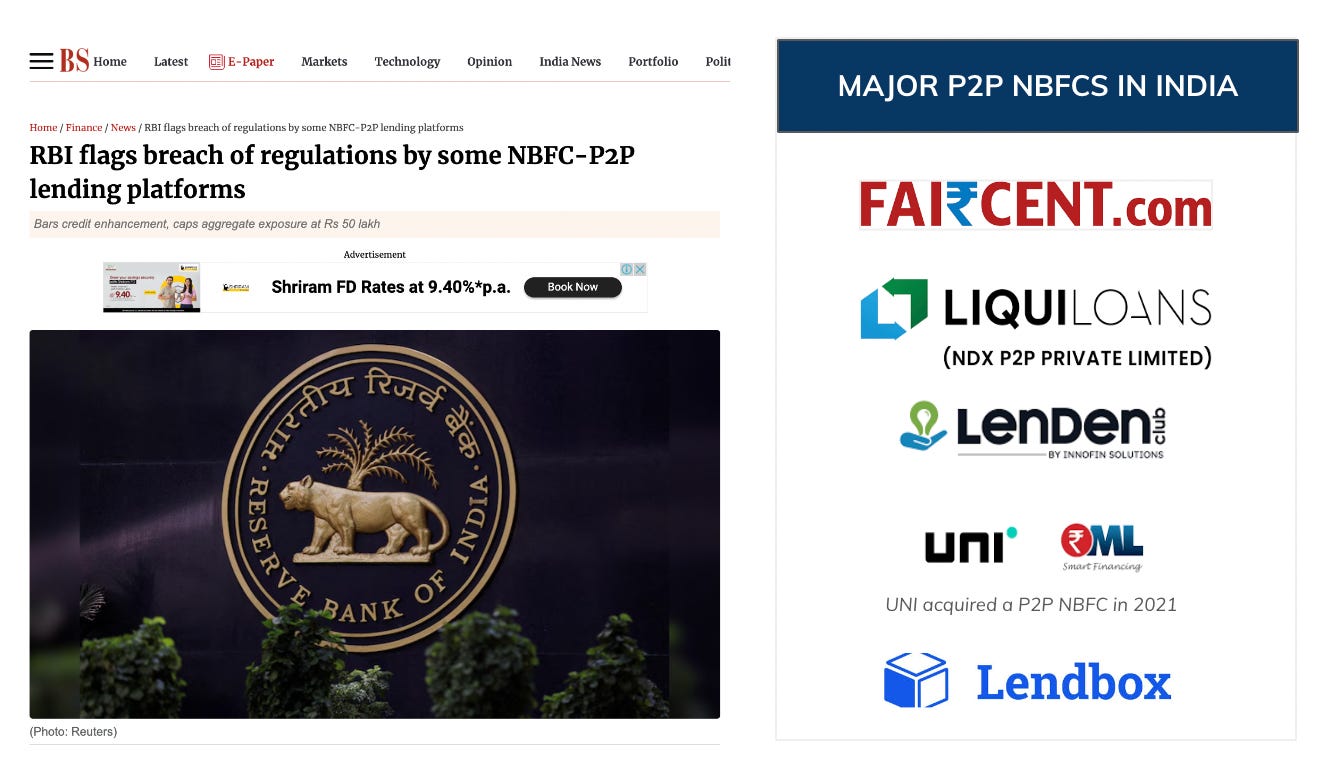 After the risk weights increase from 100 - 125% in 2023, credit supply from NBFCs seems to be drying up. And now, RBI came out with new regulations on P2P (peer to peer) lending this week.