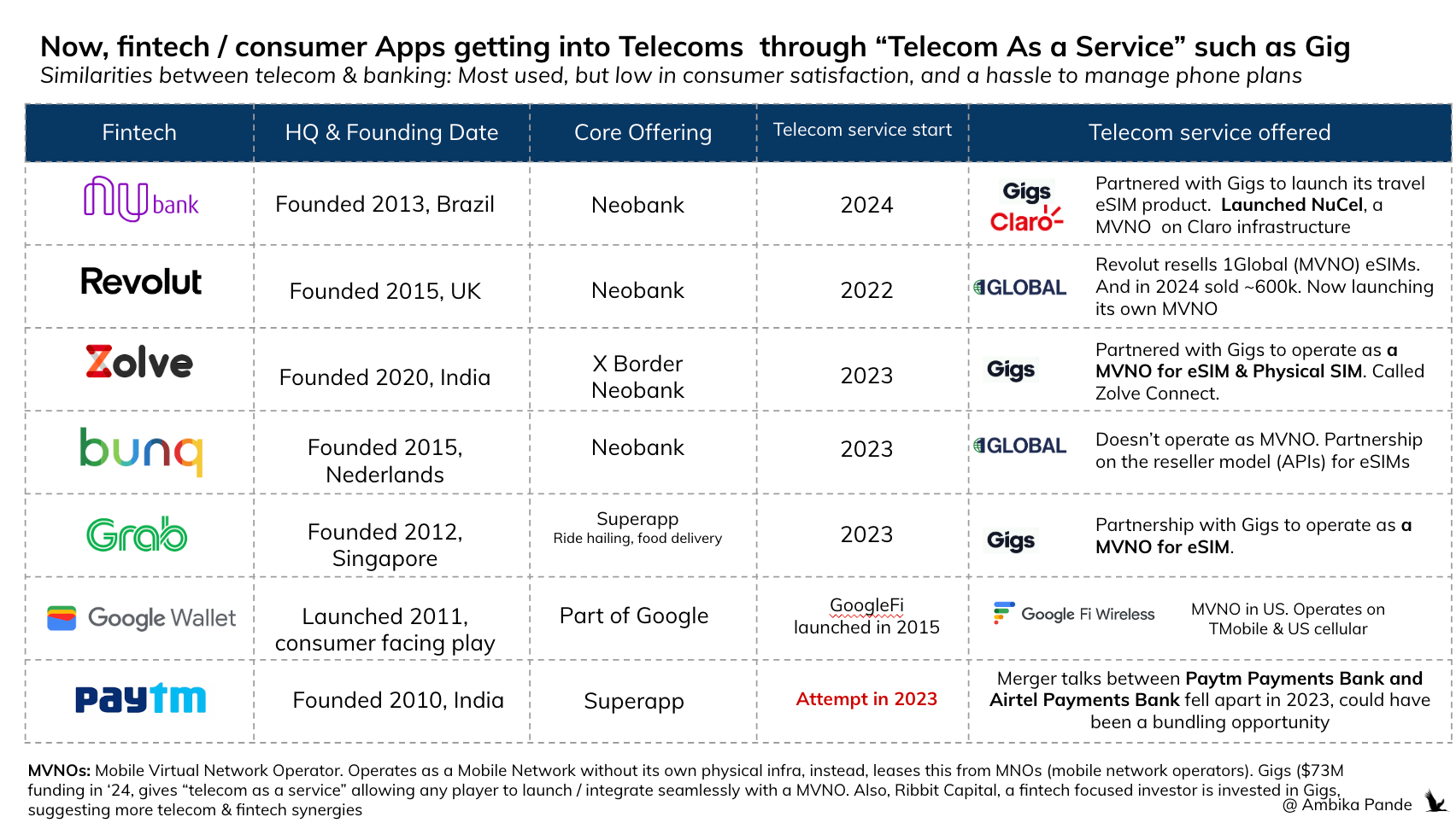 Telecom as a Service (TaaS): A key example here is Gigs ($73M funding in Dec ‘24, and valued anywhere between $300M - $400M) gives “telecom as a service” allowing any player to launch / integrate seamlessly with a MVNO. They do all the work of leasing infrastructure, partnerships with multiple telecom providers, and API solutions that allow companies to integrate telecom services into their consumer facing offering seamlessly. This is what Nubank, Bunq, Zolve & Grab have done. They’ve integrated with Gigs to either become a fully fledged MVNO under their own brand or a reseller sort of model, but in both ways, they’ve increased. the convenience of network management through a customer friendly app. : Operating as MVNO’s are: NuCel for NuBank’s Travel eSIM, or Zolve Connect for Zolve’s international telecom offering to immigrants. A point to note: a key investor in Gigs is Ribbit Capital, which is a fintech focused investor. Yet another indication of synergies between fintech & telecom. While, on the reseller model, Bunq has leveraged 1Global APIs to offer eSIM functionalities on its app, but more from a reseller perspective, not an MVNO perspective.