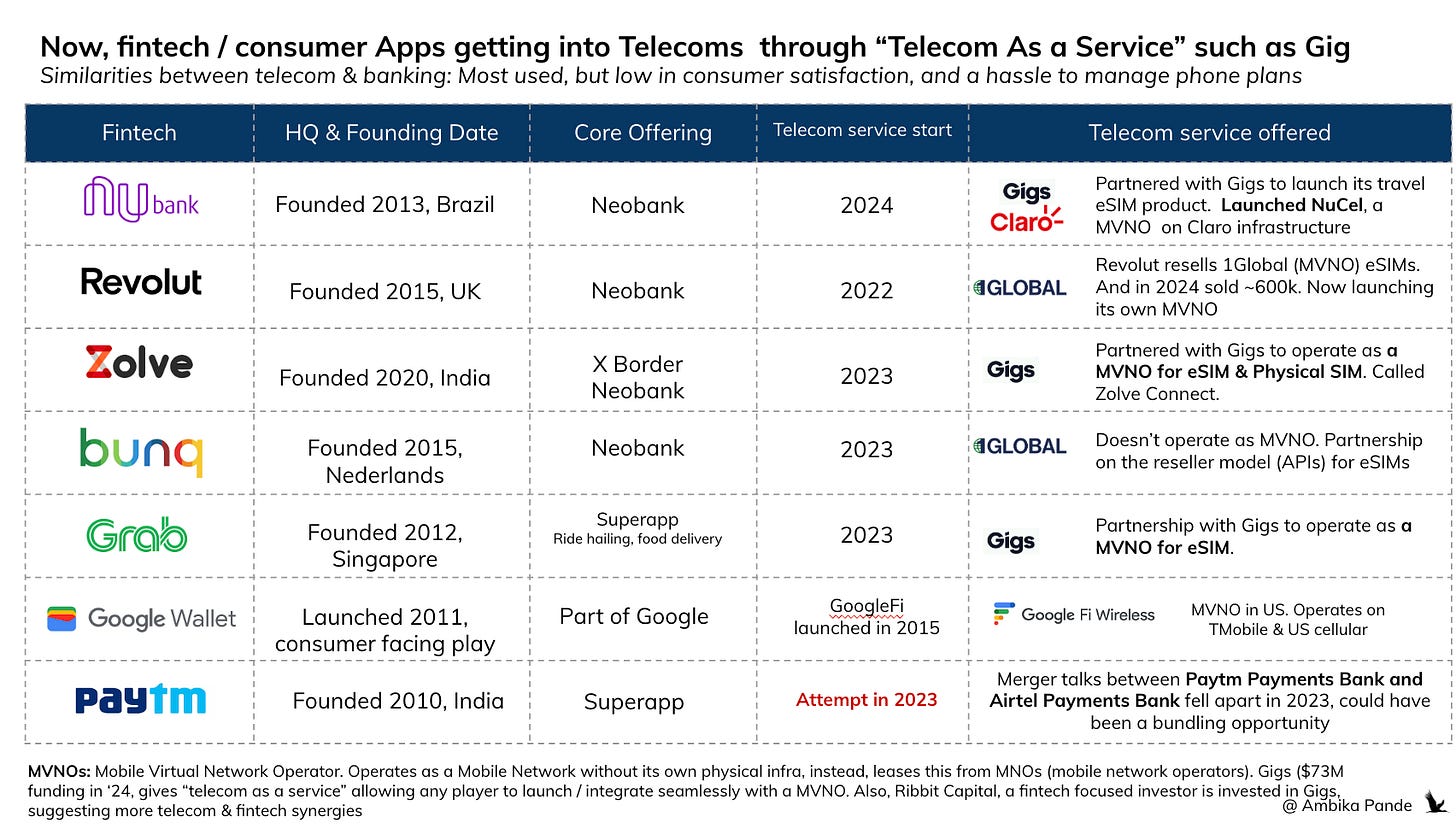 There seems to be a trend; global fintechs (ex: Nubank, Revolut) are venturing into telecom, either by becoming a MVNO, or through eSIM partnerships to increase customer acquisition & retention