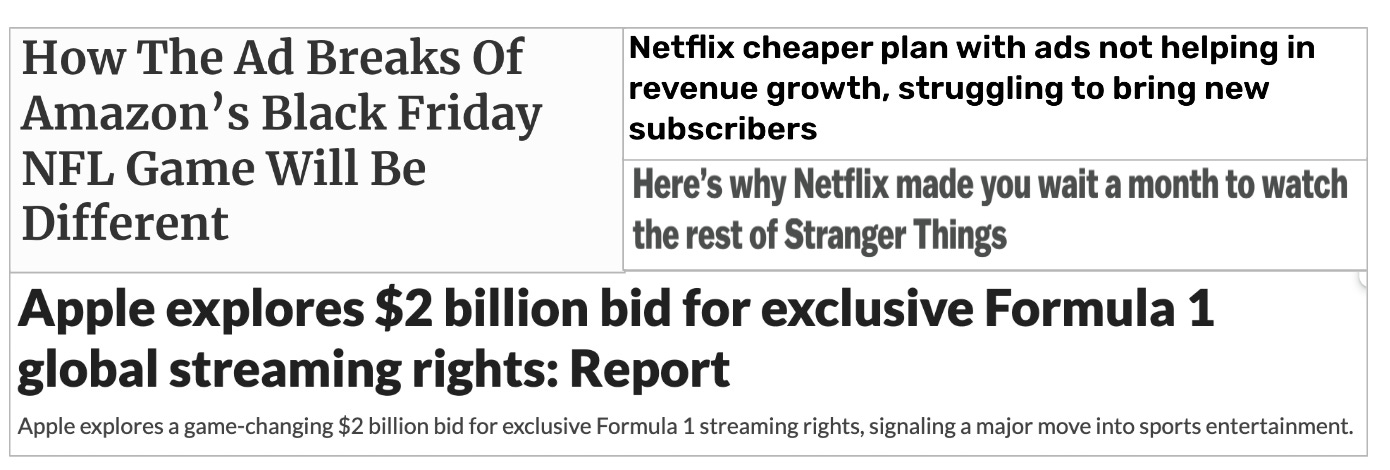 Apple & Prime Video (globally) seem to have a different strategy. They ARE investing in live sports. Take the rumors that have hit the market recently - Apple reportedly is willing to pay upto $2B for F1 streaming rights. Amazon signed a 13 year $13B deal to stream the NFL. But there is a reason why. Apple & Amazon are platforms that offer an ecosystem of products other than entertainment, so their retention strategy is different. Here the user loyalty is to the platform, and not just to the live sport content, which is the case for pure-play streaming platforms such as Hotstar & Netflix.