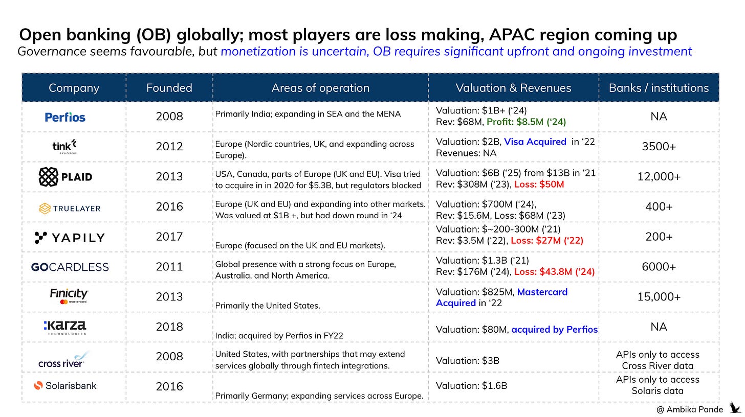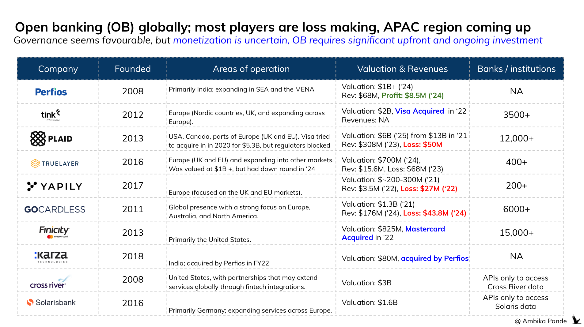 And while these entities are valued in the billions of dollars (check out the table below), the problem here is that monetization is still very uncertain. Except for Perfios, which reportedly made a profit of $8.5M in FY24, the rest are all making losses in $M. While others have been acquired. Ex: Visa acquired Tink in FY22 for $2B, and tried to acquire Plaid in FY20 for $5.3B but this didn’t go through because of regulatory blockers. Mastercard acquired Finicity for $825M in FY22. And Perfios acquired Karza in FY22 for $80M.