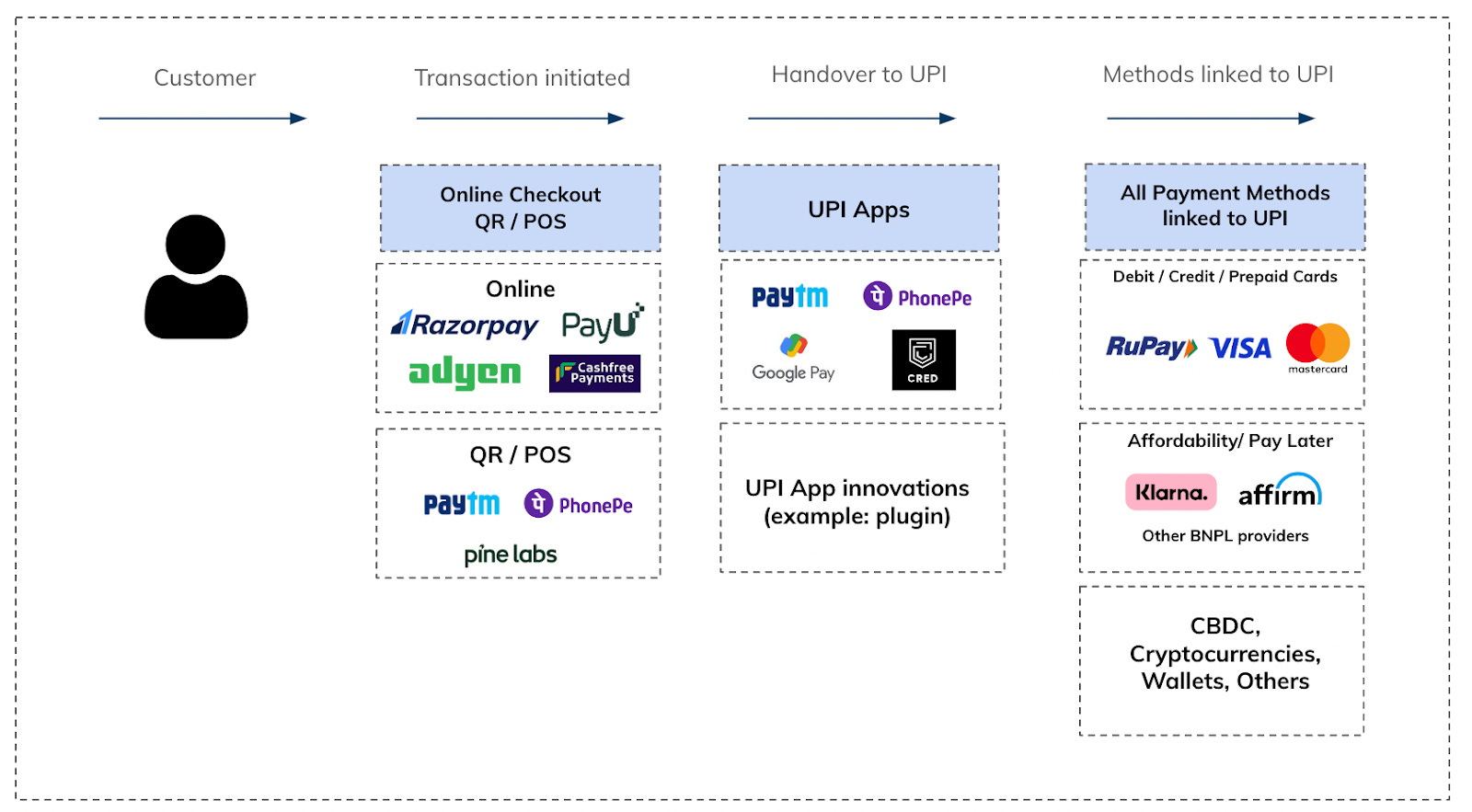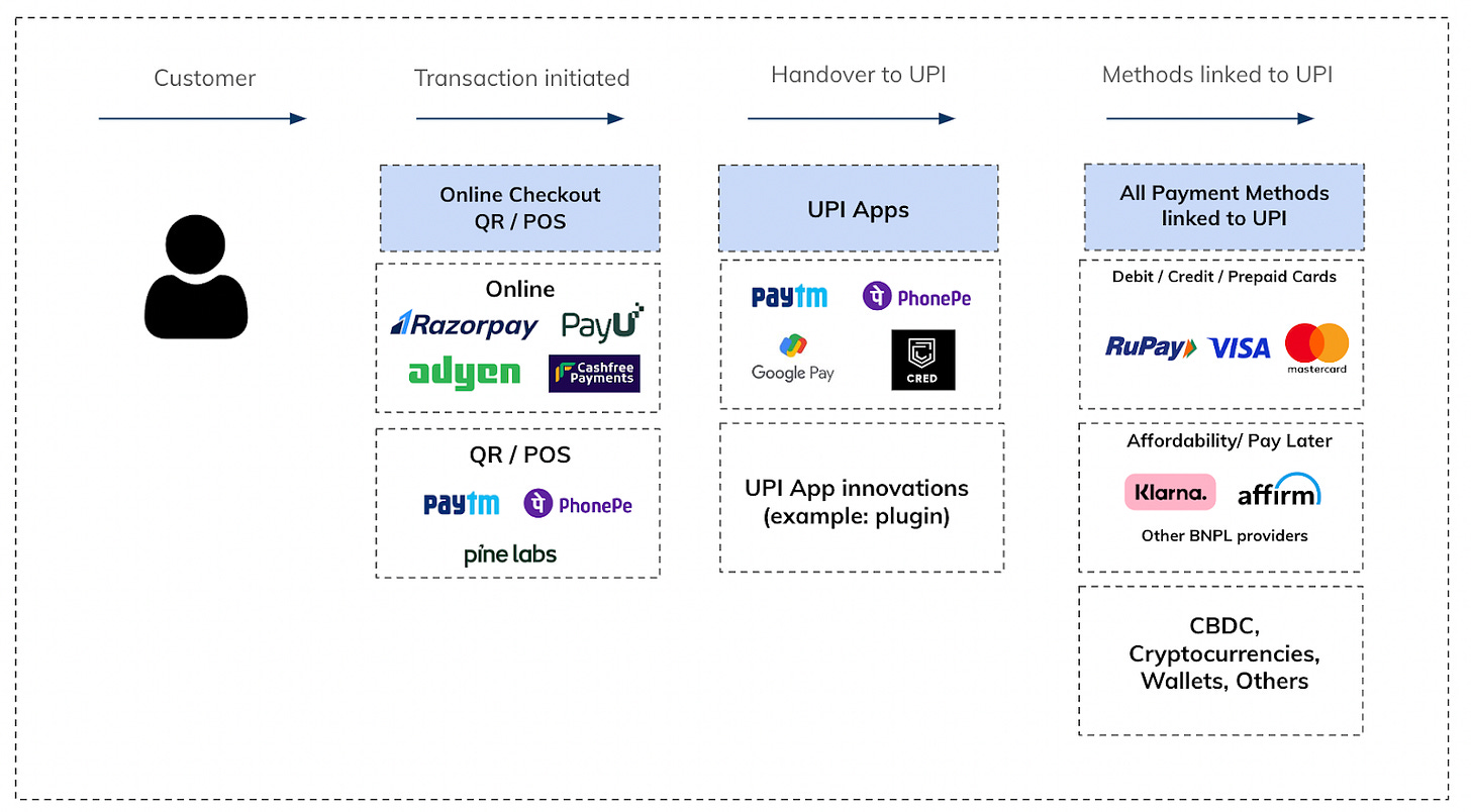 These different payment methods have vastly different checkout journeys, and as consumers get more comfortable paying using RTP rails, and with a greater % of transactions being powered by RTP, the hypothesis is that they will look for standardized payment journeys, which are as close to the RTP journey as possible. And thus the natural next step: linking all payment methods to RTP rails, making RTP, and UPI the “checkout of the future” (first coined by Vijeth Pandit - Senior Director, Product at Razorpay)