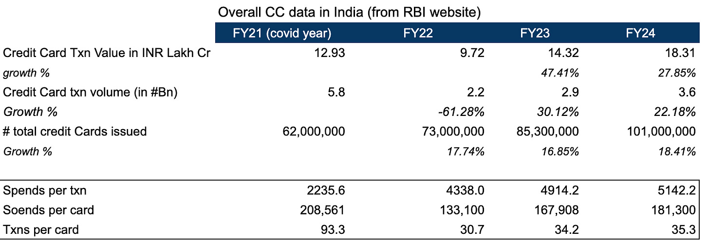 Credit card spends, and transaction volume on credit cards are increasing no doubt. In FY24, the CC spends and volume were INR 18 Lakh Cr & 3.5B txns, compared to FY23 spends and volume which were INR 14 Lakh Cr & 2.9B txns.