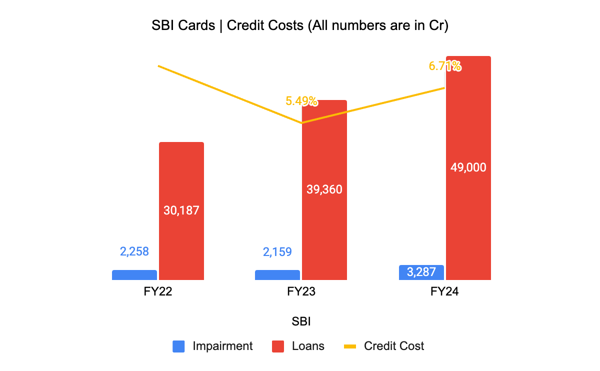 Monitor the credit losses of the co-branded card segment: SBI Cards annual reports show that credit loss (calculated as impairment of financial instruments / loans) is between 5.5% - 7% for SBI cards. (For ease of analysis, have looked at the SBI cards annual reports, since they are a separate entity).